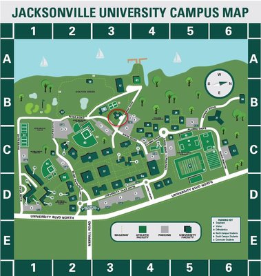 Map Of Jacksonville University Parking & Directions | Jacksonville University in Jacksonville, Fla.: Classes at the new Downtown campus of Jacksonville University College of Law began Aug. 12 with 83 students enrolled. The student body includes the college’s cohort of 44 first-year students, dubbed . A high school Geographic Information Systems class project is helping to make a positive impact on programs available in Jacksonville. .